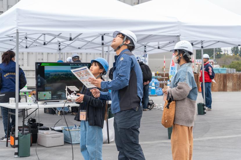 工事概要などの説明後、班に分かれてトンネル探検ツアー、立坑専用エレベータ試乗体験、トロッコ試乗体験、ドローン飛行体験、重機試乗体験などを実施しました。