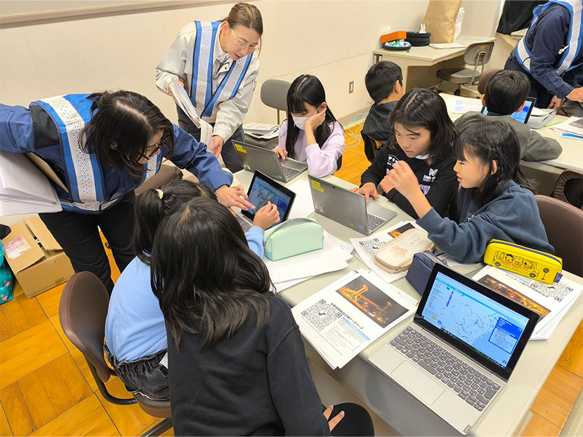 先生役の女性土木技術者(ドボジョ)が土木の仕事や橋について説明。建女ひばり会は橋のセルフメンテナンスを担当し、参加者とともに橋の映像を見ながら点検を実施し、セルフメンテナンスの方法や重要性を説明しました。